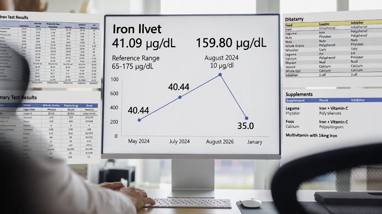 Lack of consistent high-dose vitamin C paired with iron intake: My good August 2024 result (159.80 μg/dL) occurred when taking iron + vitamin C together. Vitamin C can boost non-heme iron absorption 2–6×. The multivitamin has some vitamin C, but not concentrated with the iron dose, reducing absorption efficiency significantly.